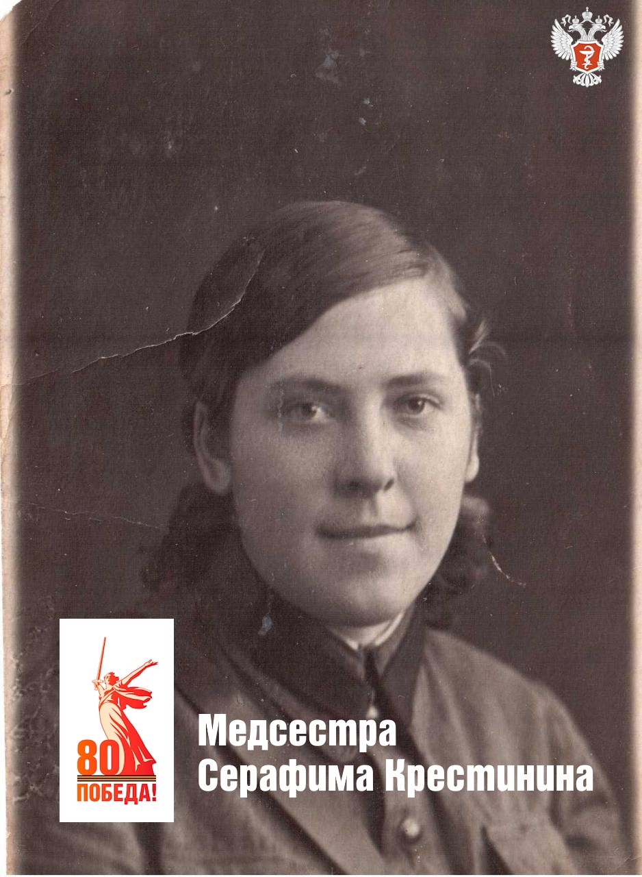 Когда началась война ее призвали на фронт и мобилизовали в Рабоче-крестьянскую Красную Армию. Серафима Крестинина трудилась старшей медсестрой 1-го хирургического отделения госпиталя.