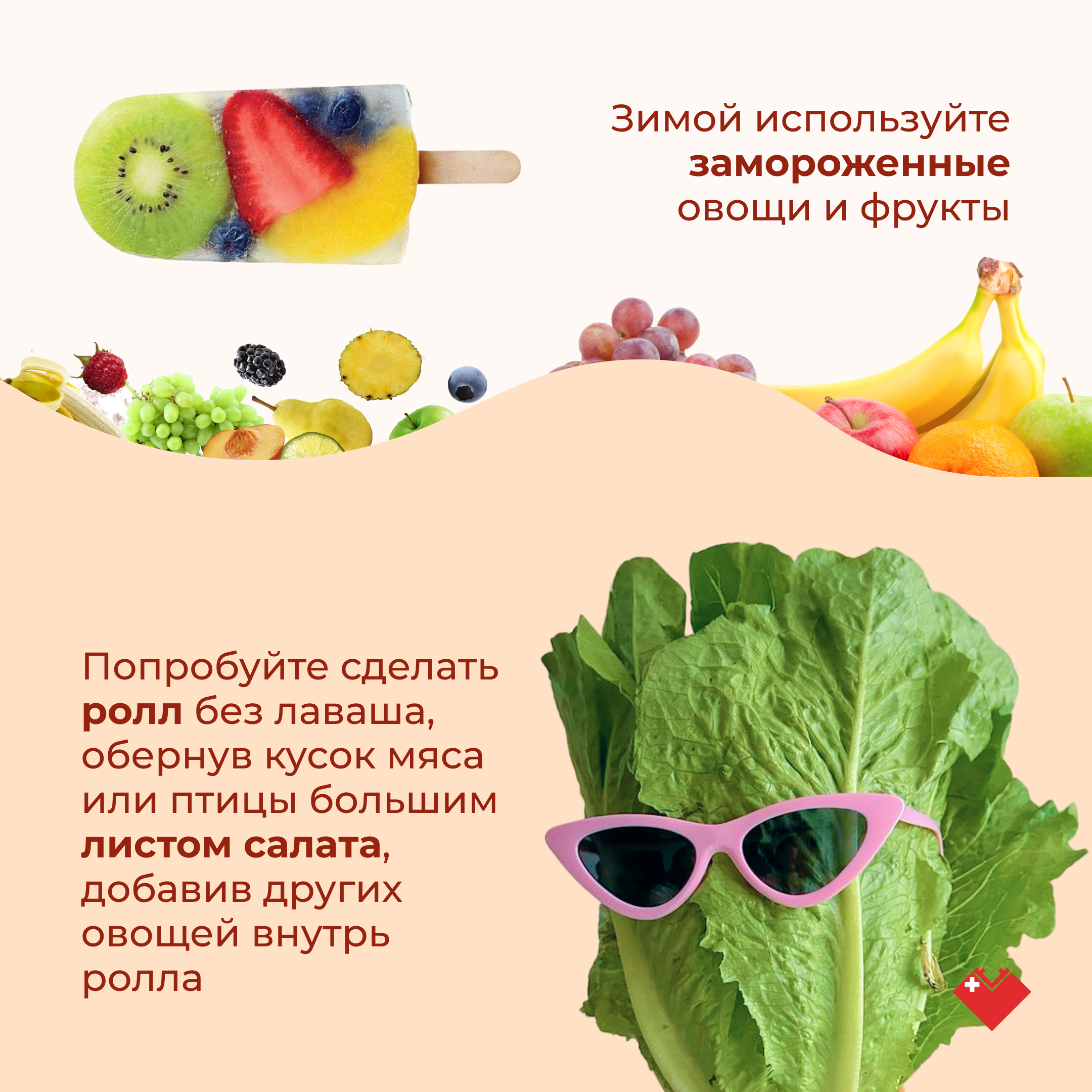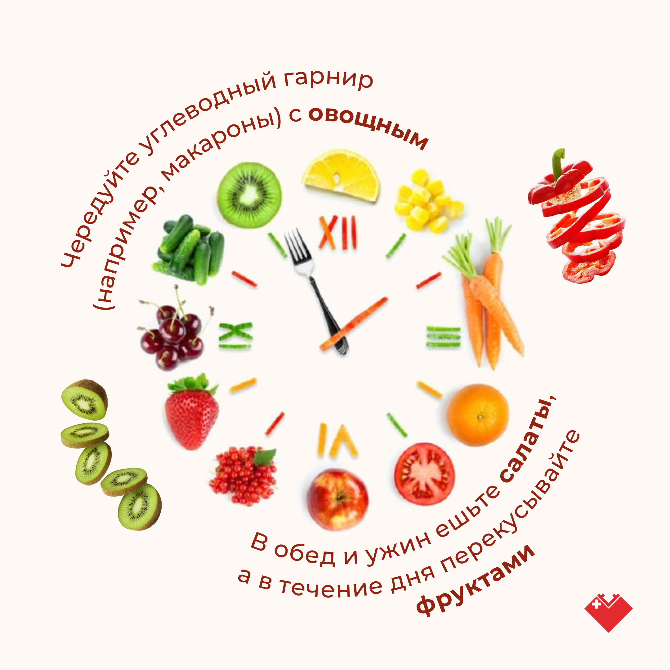 «Чередуйте углеводный гарнир (например, макароны) с овощным. В обед и ужин обязательно ешьте салаты, а в течение дня перекусывайте фруктами. Но помните, нежелательно употреблять сладкие фрукты и крахмалистые овощи во второй половине дня, - отмечает диетолог. - Зимой отлично подойдут овощи, фрукты и ягоды глубокой (шоковой) заморозки. При таком способе заготовке они лучше сохраняют ценные биологически активные вещества».