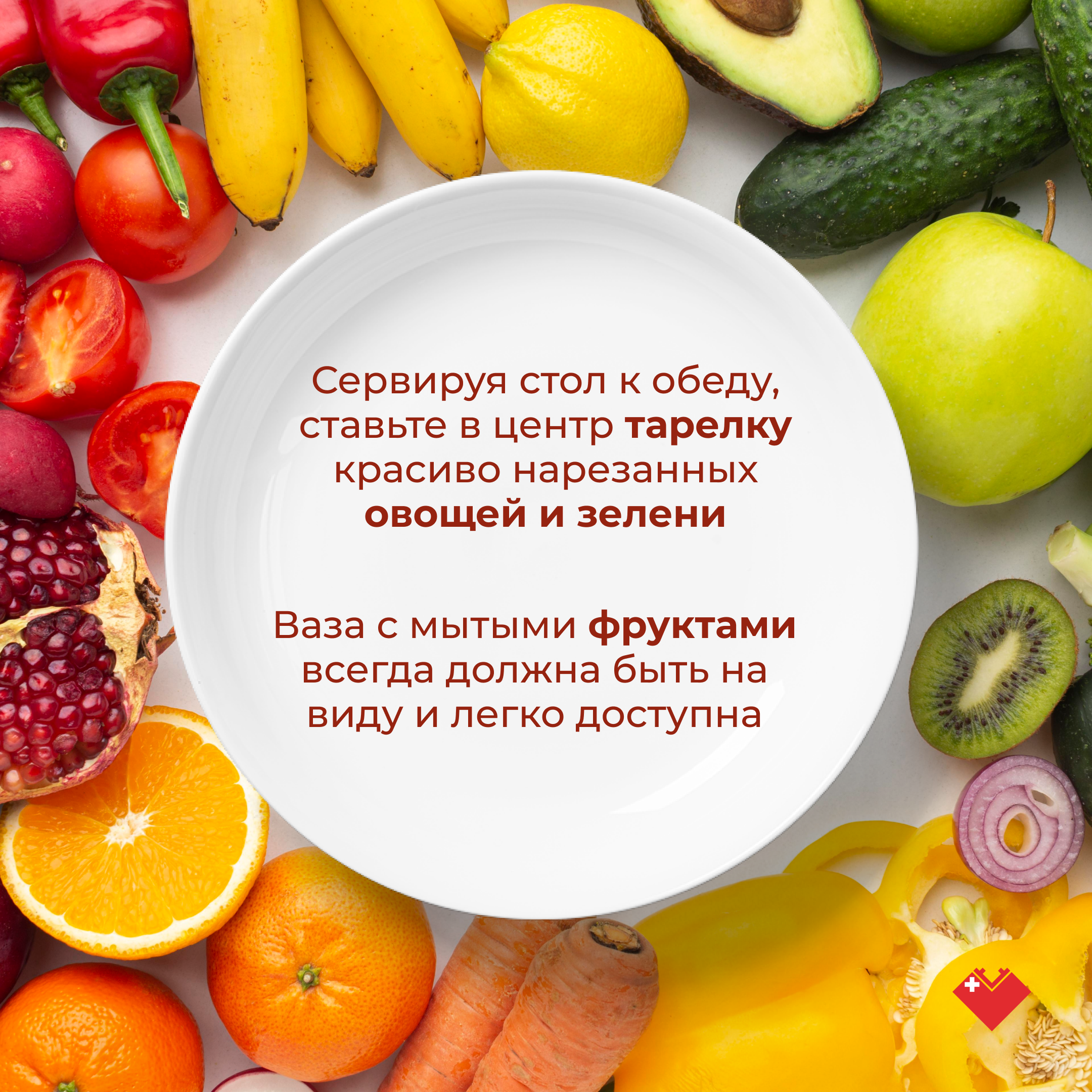Чтобы увеличить количество овощей и фруктов в своем рационе необходимо придерживаться несложных правил. Например, сервируя стол к обеду, ставить в центр тарелку красиво нарезанных овощей и зелени. Ваза с мытыми фруктами всегда должна быть на виду и легко доступна.