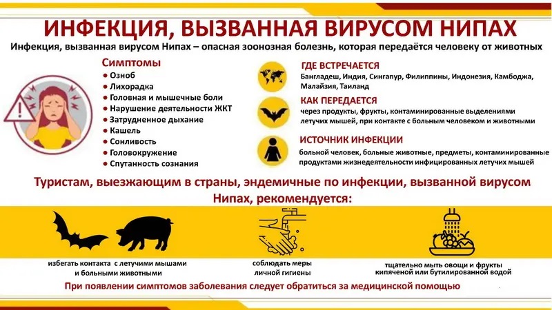 В настоящее время отмечается ухудшение эпидемиолгической ситуации в Индии и Республике Бангладеш. На данных территориях зарегистрированы случаи инфекционного заболевания, вызванного вирусом Нипах (далее – БВВН). Также циркуляция вируса отмечена на территориях Камбоджи, Индонезии, Филиппин, Таиланда, Ганы и Мадагаскара.