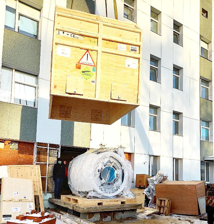 Томограф весит 3,5 тонны, его уже занесли в помещение. На данный момент он охлаждается посредством подачи проточной холодной воды. В ближайшие недели предстоит собрать и подключить климатическую систему и установить аппарат.