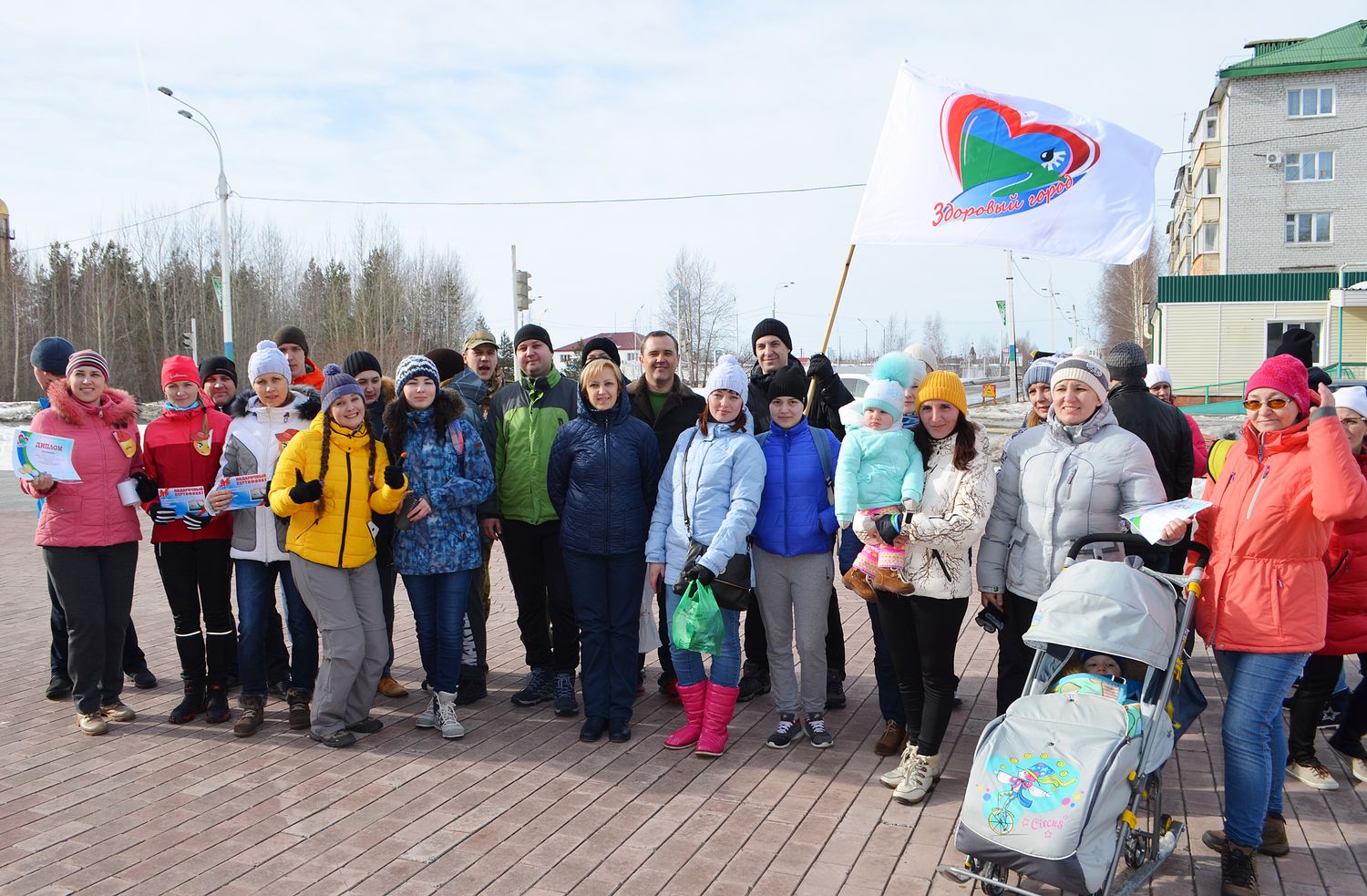 Далее под зажигательные ритмы музыки на площади перед ДС «Звезды Югры» командам и болельщикам провели небольшую разминку. После чего участники «Дня здоровья» отправились по маршрутам.
