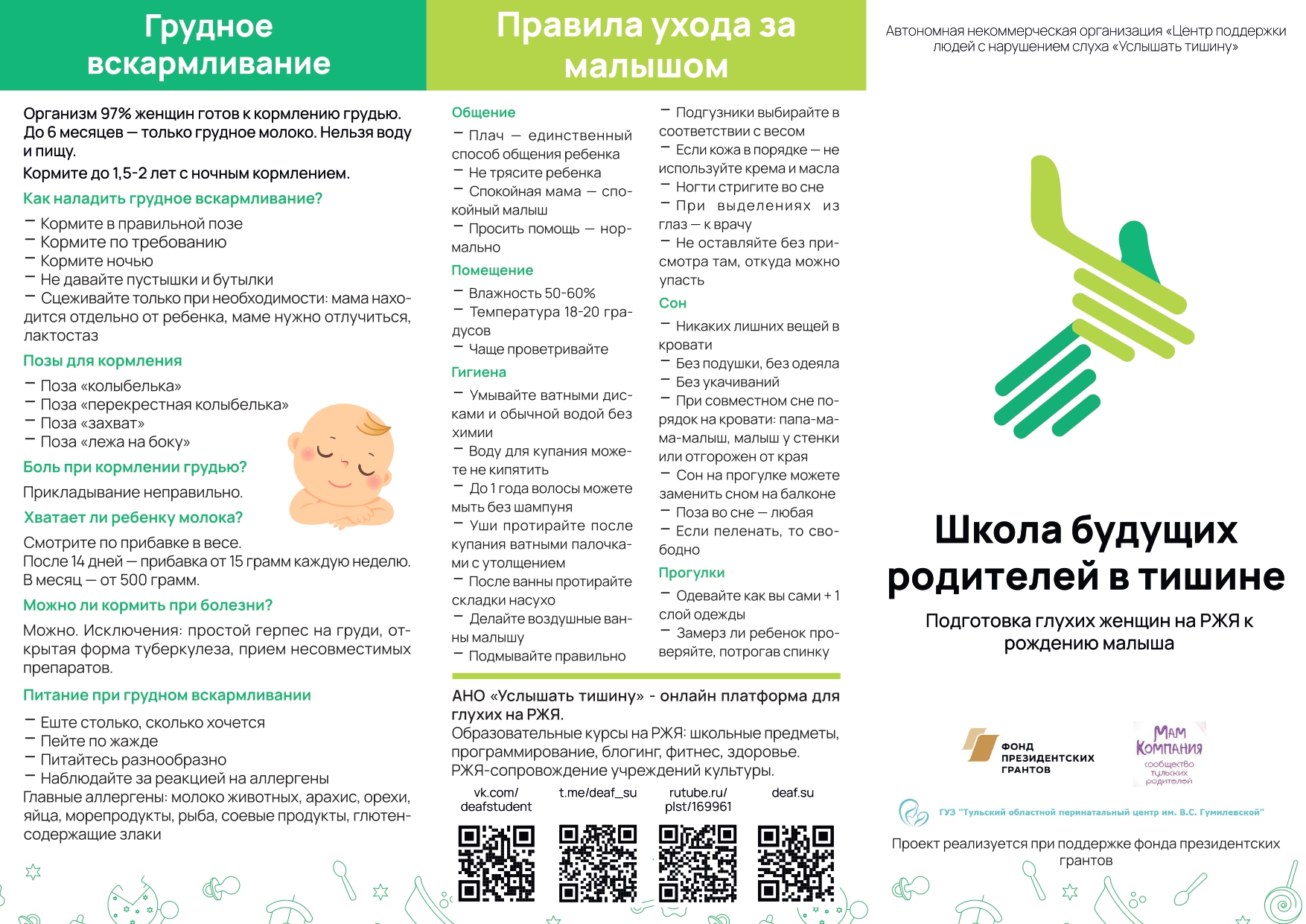 Одна из миссий центра: подготовка глухих женщин к родам и первой недели жизни малыша на русском жестовом языке. «Мы уверены, что готовность женщины к этому новому периоду жизни – это залог здоровья, спокойствия и счастья мамы и ее малыша. Мы считаем, что у каждой глухой женщины должно быть право подготовиться к родам на своем родном языке – русском жестовом языке. Мы верим в ценность и пользу знаний на РЖЯ», – говорится на сайте организации. С более подробной информацией о деятельности центра, а также с видео уроками можно ознакомиться по ссылке.