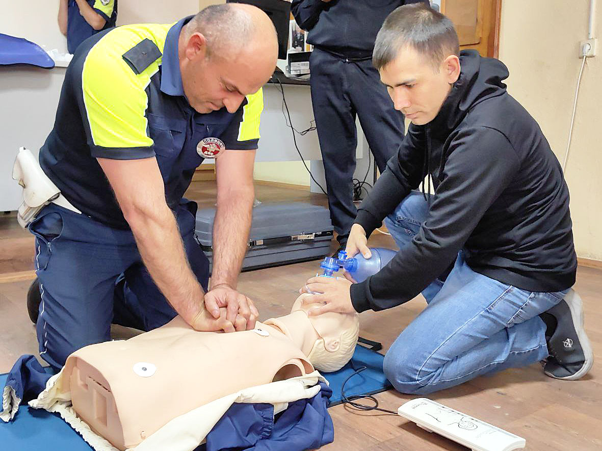 – В первую очередь необходимо оценить состояние пострадавшего: проверить сознание и дыхание. Если он не реагирует на внешние раздражители, то переходим к следующему пункту – приему «вижу, слышу, ощущаю». Это проверка наличия дыхательных движений грудной клетки и живота, слышу и ощущаю – наклониться и ухом послушать, почувствовать дыхание. Если его нет, то приступаем к сердечно-легочной реанимации, – поясняет Денис Геннадьевич.
