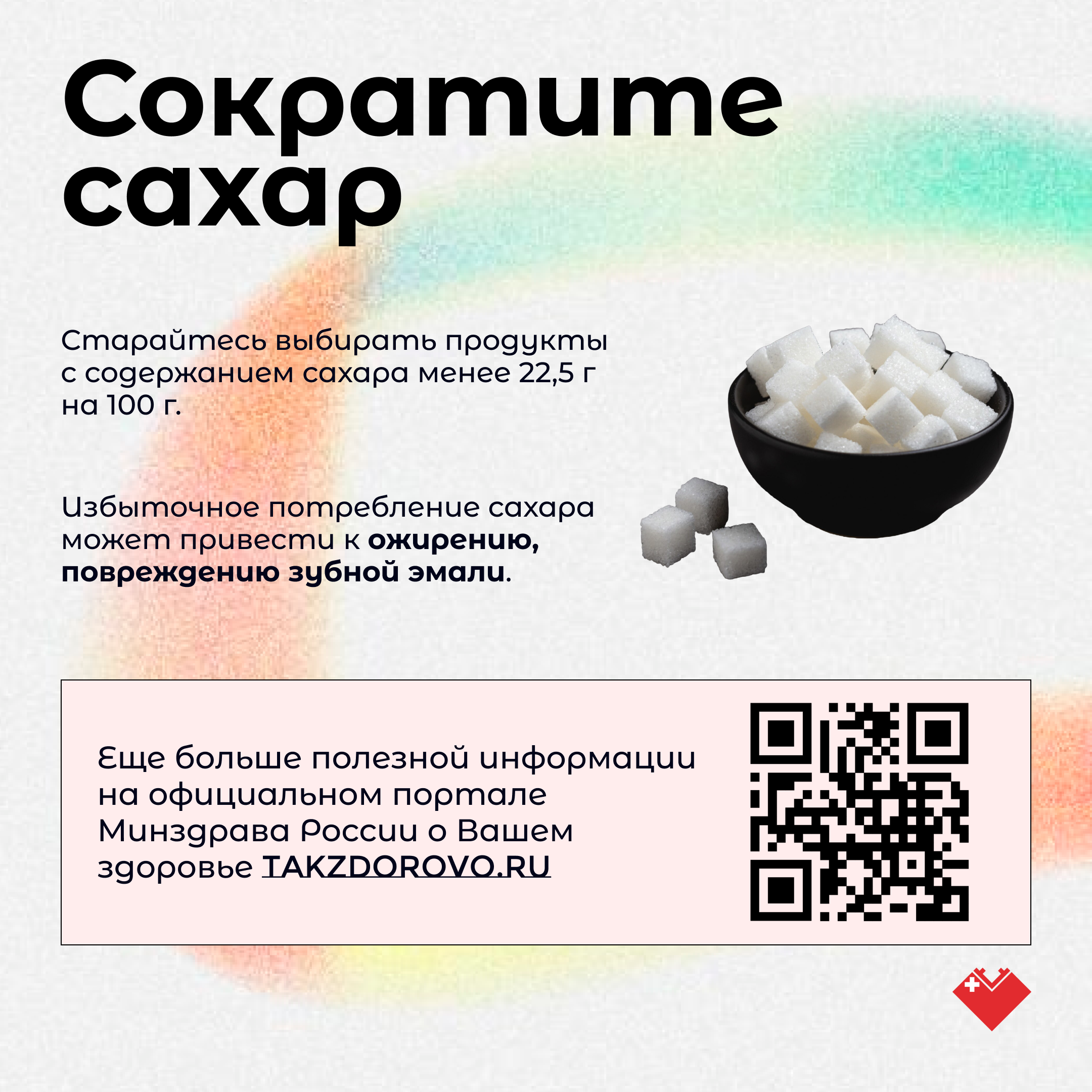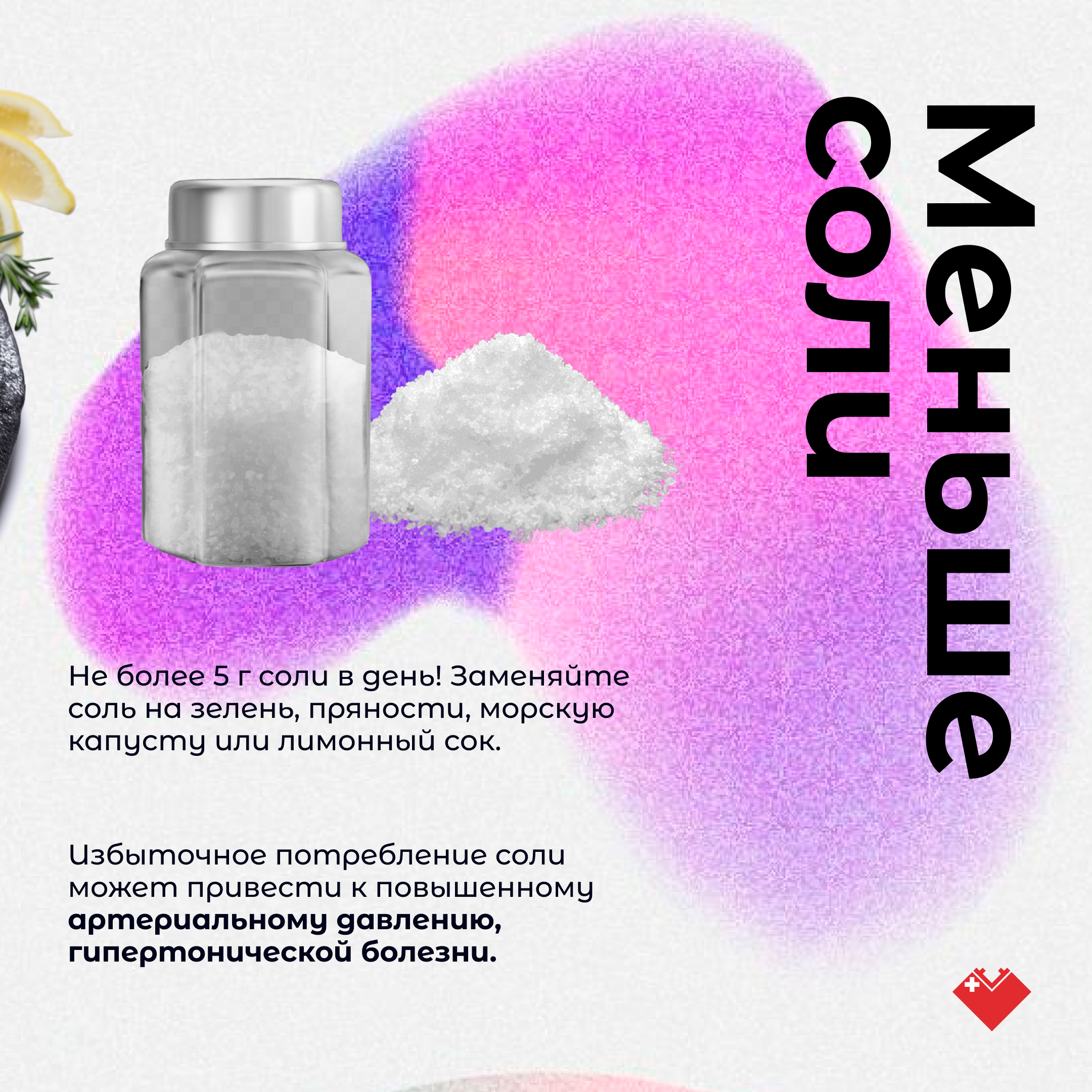 «Ограничьте употребление сахара в пище. Большинство готовых продуктов содержат большое количество сахара. Это касается сладких газированных напитков, пакетированных соков с добавлением сахара, алкоголя, выпечки, сладких йогуртов и, конечно, конфет и шоколада. Допускается употребление 50 граммов сахаров в сутки, - отмечает диетолог. - Ешьте меньше соли. Взрослому человеку рекомендовано употреблять не более 5 г соли в день (одна чайная ложка без горки). Избыточное ее потребление приводит к развитию повышенного артериального давления и гипертонической болезни».