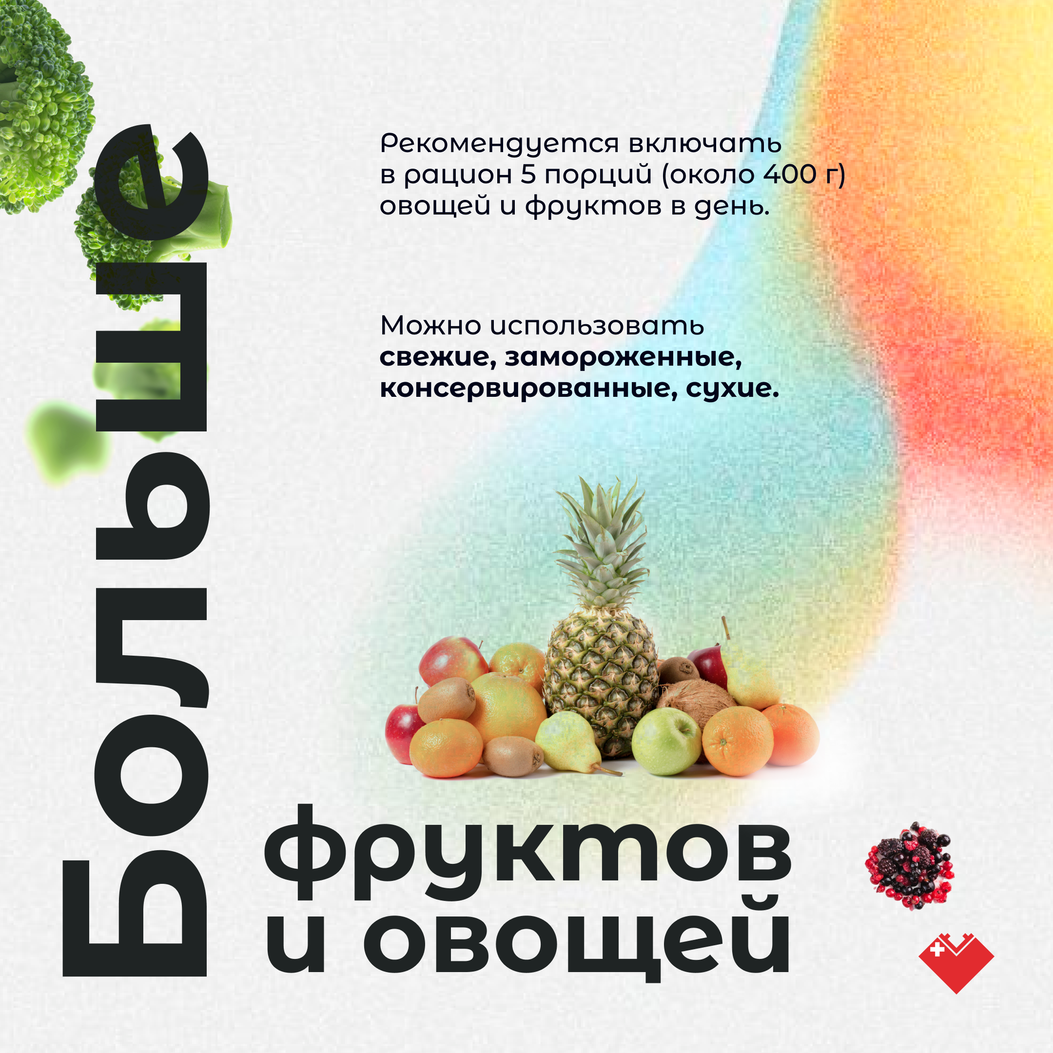 В рационе фрукты и овощи могут быть свежими, сухими, замороженными или консервированными, но без добавления соли и сахара. Взрослым людям рекомендуется включать в рацион 5 порций овощей или фруктов в день (примерно 400 граммов).