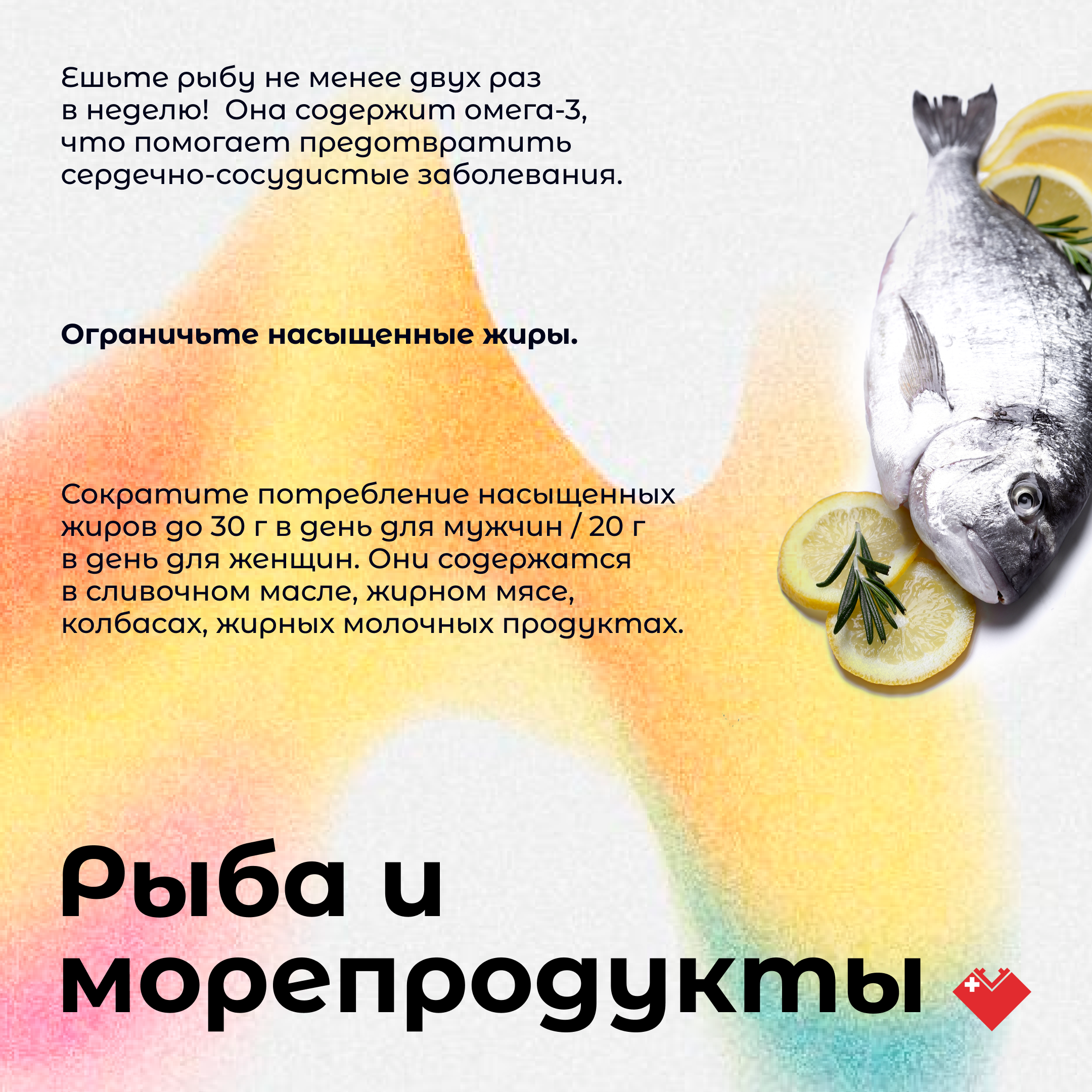 Важно ограничить потребление насыщенных жиров. Постарайтесь заменять насыщенные жиры ненасыщенными, которые содержатся в растительных маслах, авокадо, рыбе. Сократите употребление продуктов глубокой промышленной переработки (чипсы, снеки, мясоколбасная продукция и др.)