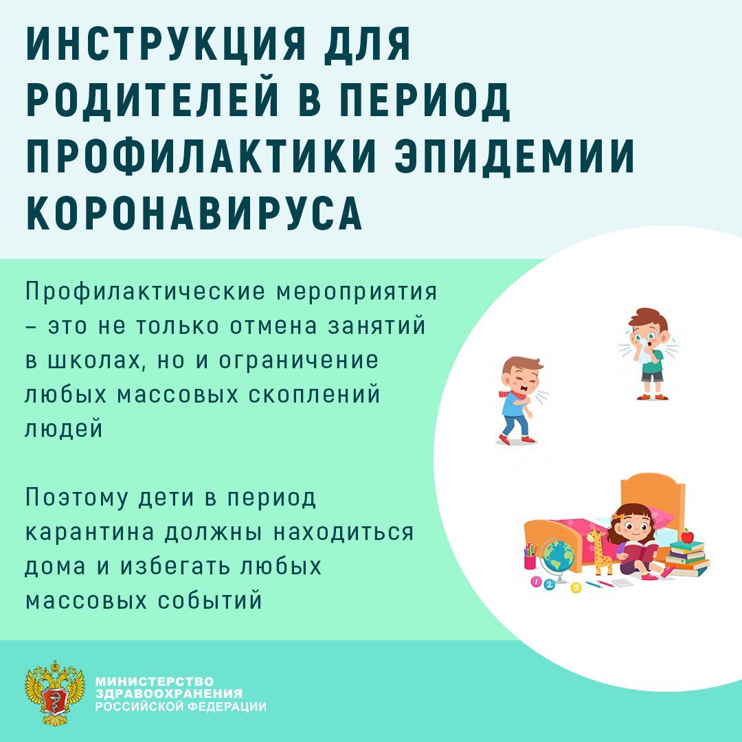 Профилактические мероприятия - это не только отмена занятий в школах, и ограничение любых массовых скоплений. Поэтому дети в период карантина должны находиться дома и избегать любых массовых событий.