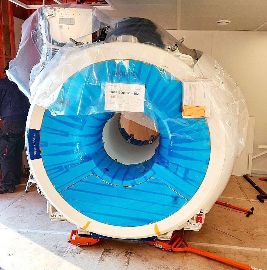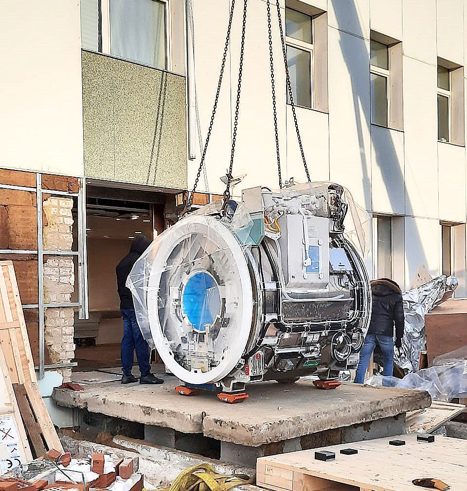 Томограф весит 3,5 тонны, его уже занесли в помещение. На данный момент он охлаждается посредством подачи проточной холодной воды. В ближайшие недели предстоит собрать и подключить климатическую систему и установить аппарат.