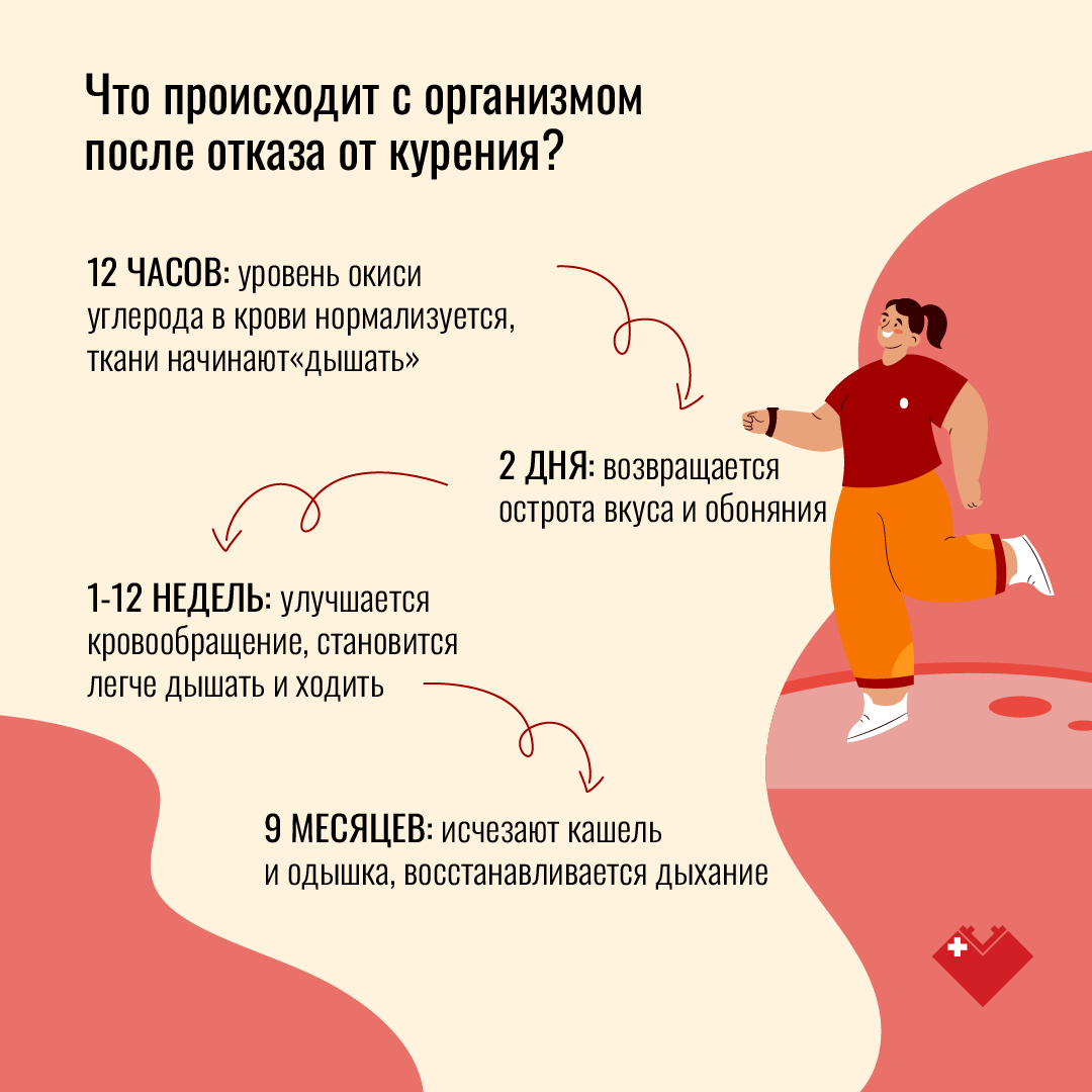 По словам эксперта, после воздержания от сигарет на 12 часов уровень окиси углерода в крови нормализуется, ткани начинают «дышать», после двух дней отказа от курения возвращается острота вкуса и обоняния, через 9 месяцев - исчезают кашель и одышка, восстанавливается дыхание.