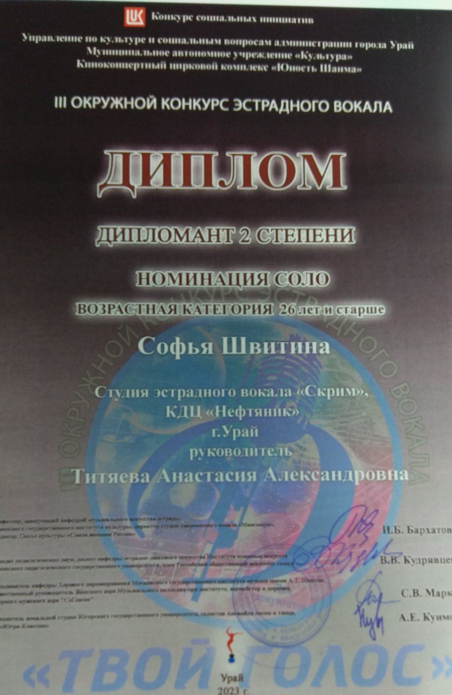 В номинации «Соло» диплом 2 степени получила Софья Швитина, менеджер отделения платных услуг Урайской больницы, исполнившая арию из оперы «The Diva Dance» – «Лючия ди Ламмермур».