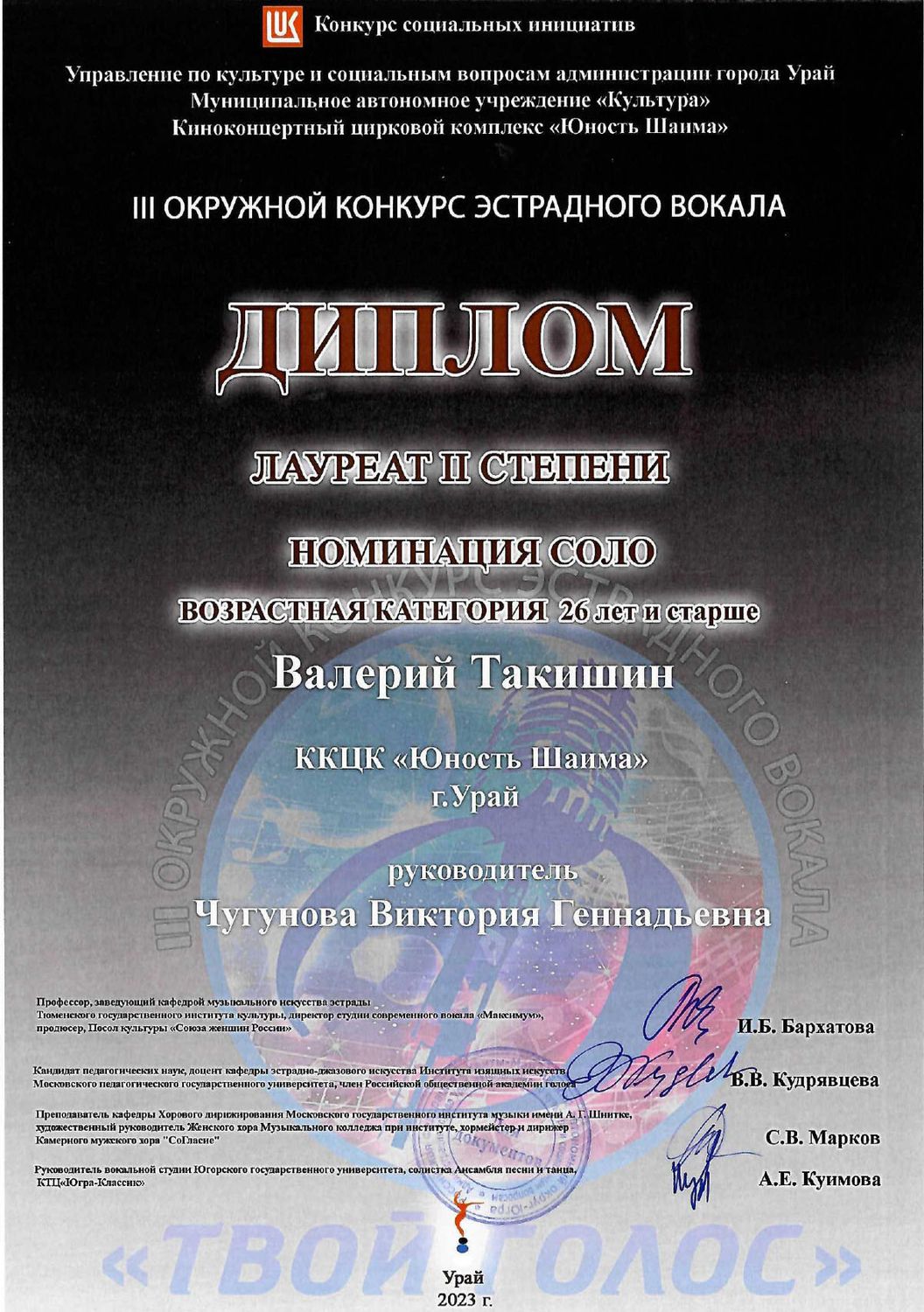 В той же номинации диплом лауреата II степени вручили Валерию Такишину, начальнику гаража. Он представил на конкурс песню Александра Розенбаума «По снегу, летящему с неба».