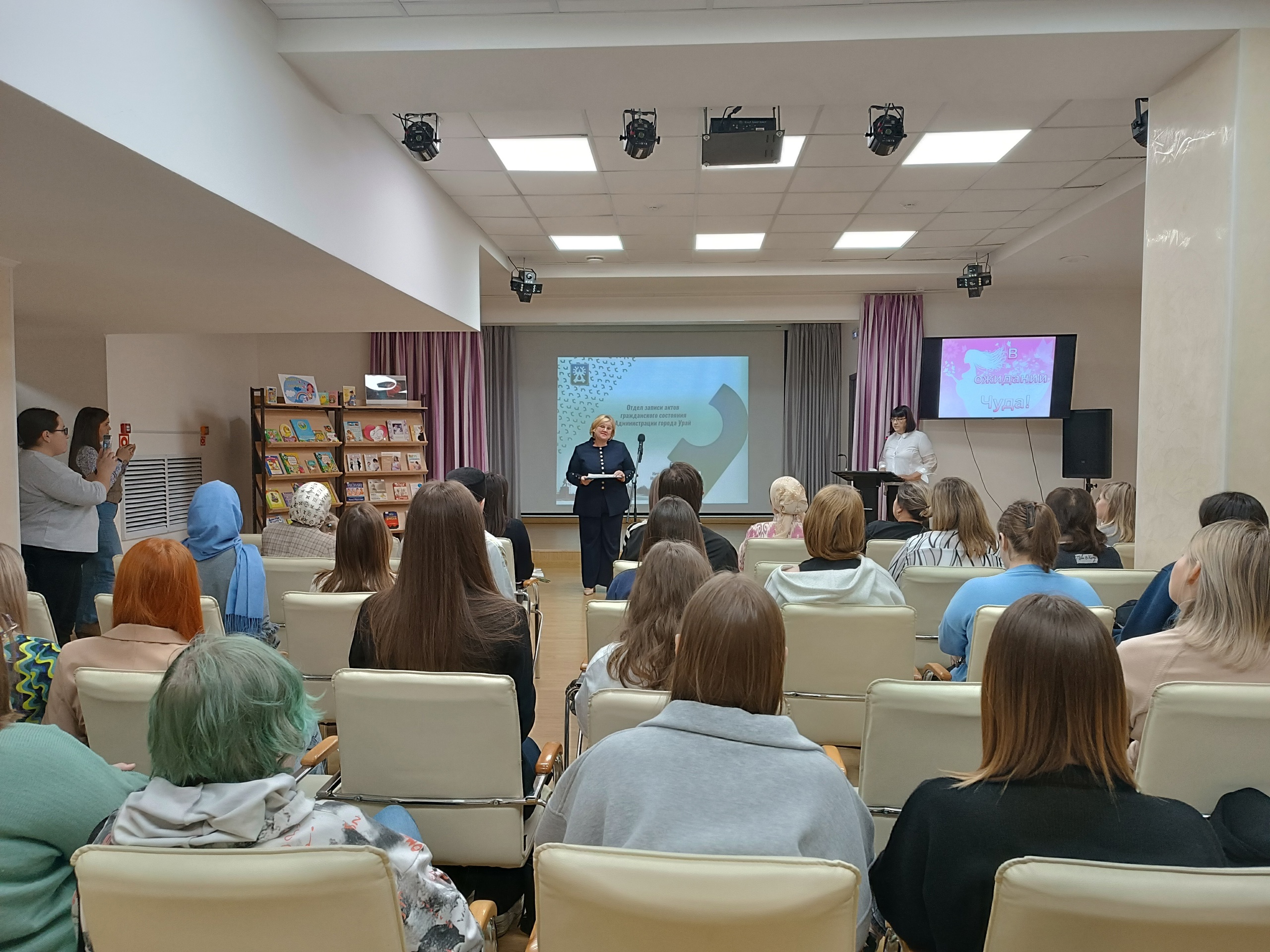 Библиотекарь Марина Витальевна Кузнецова поговорила с будущими мамами о пользе чтения во время беременности и о том, какие книги подойдут младенцам. Начальник отдела ЗАГС Лариса Валентиновна Мозговая рассказала о процедуре регистрации рождения детей и самых популярных именах новорожденных в Урае, а также подарила обложки к первым государственным документам малышей – «свидетельствам о рождении».