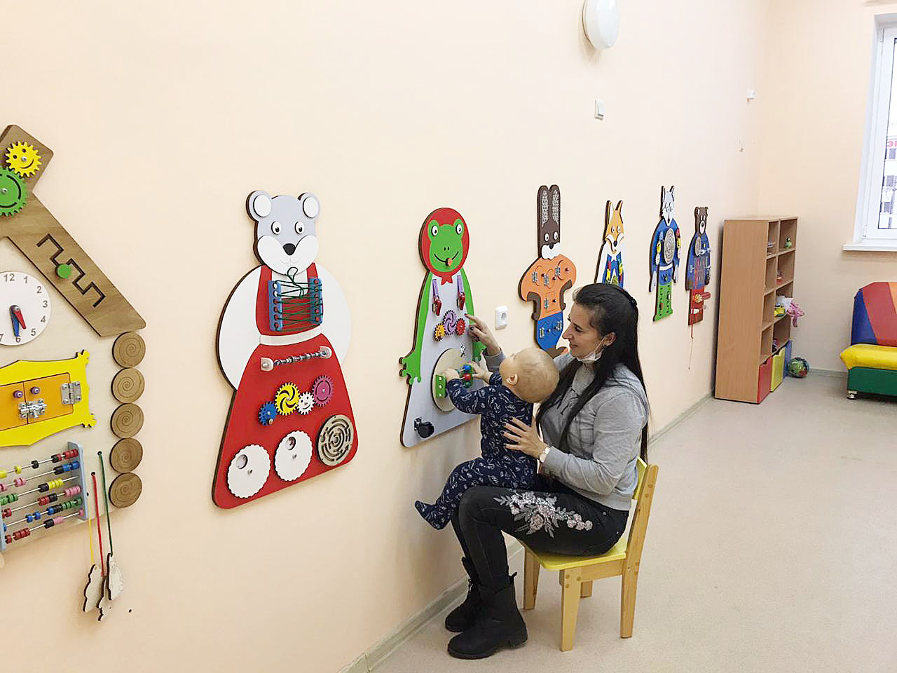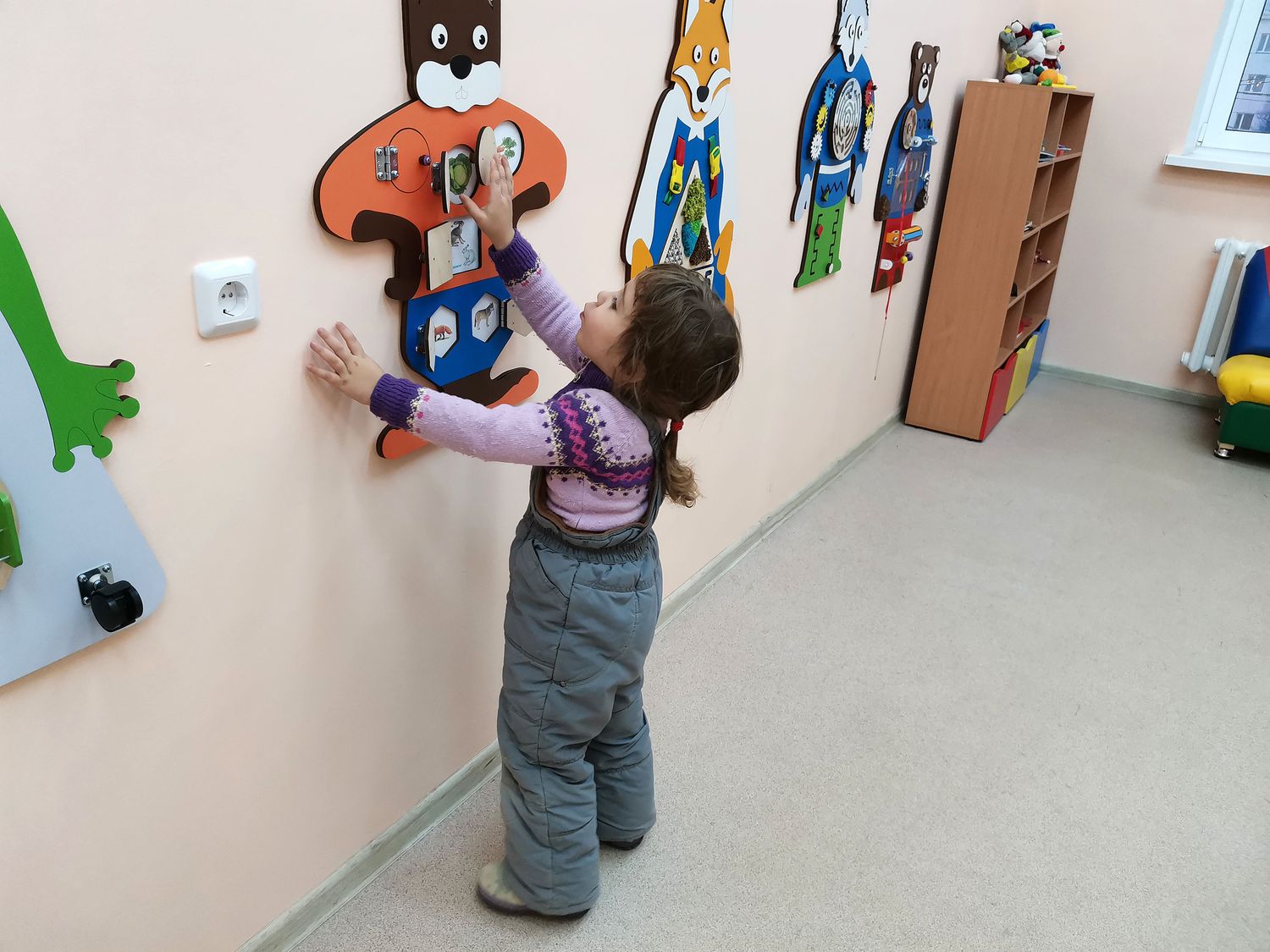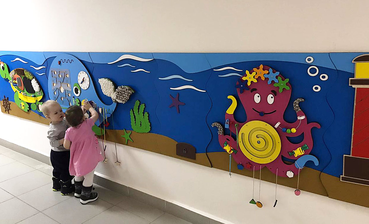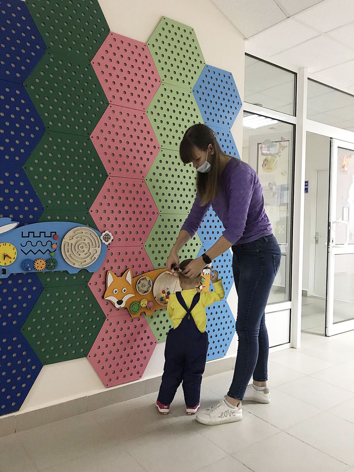 Второй этаж детской поликлиники около прививочного кабинета превратился в подводный мир, а на стенах комнаты комфортного ожидания появились фигурки из русских народных сказок. На третьем этаже разместился большой крокодил. «Это не просто красивые украшения из дерева, – отмечает старшая медицинская сестра детской поликлиники Елена Прокина. – Это развивающие игры с различными элементами для развития мелкой моторики и мышления ребенка. Тут есть тактильные элементы, вентили, шнуровки, шестеренки и прочие детали, которые интересны и безопасны ребенку для самостоятельного исследования окружающего мира. Для обеззараживания все бизиборды обрабатываются дезинфицирующим раствором».